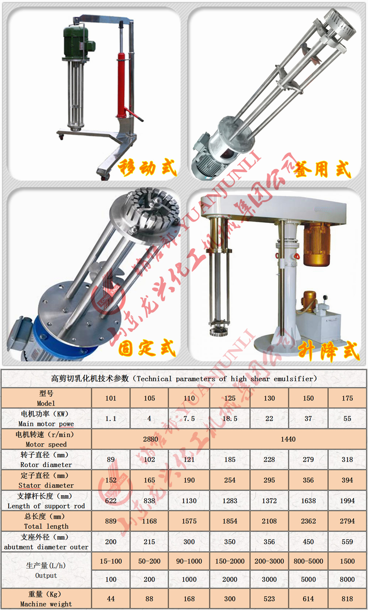 一般情況下110以下規(guī)格配有移動式吊架,同時乳化機也可設(shè)計制作成升降式的,升降式一般可分為機械升降或者液壓升降兩種。