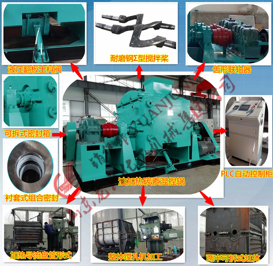碳素捏合機(混捏鍋)用于碳素、電碳、鋁、石墨廠等工礦企業(yè)生產(chǎn)的各種規(guī)格的石墨化電極、陽極糊、高純度石墨、電碳刷及高爐塊等產(chǎn)品,通過一對不同轉(zhuǎn)速攪拌漿所產(chǎn)生強烈的剪切、擠壓及攪拌,以石油焦、無煙煤、冶金焦為主要原料,煤瀝青為粘結(jié)劑所構(gòu)成的物料充分混捏,達到物料均質(zhì)及細化之目的。