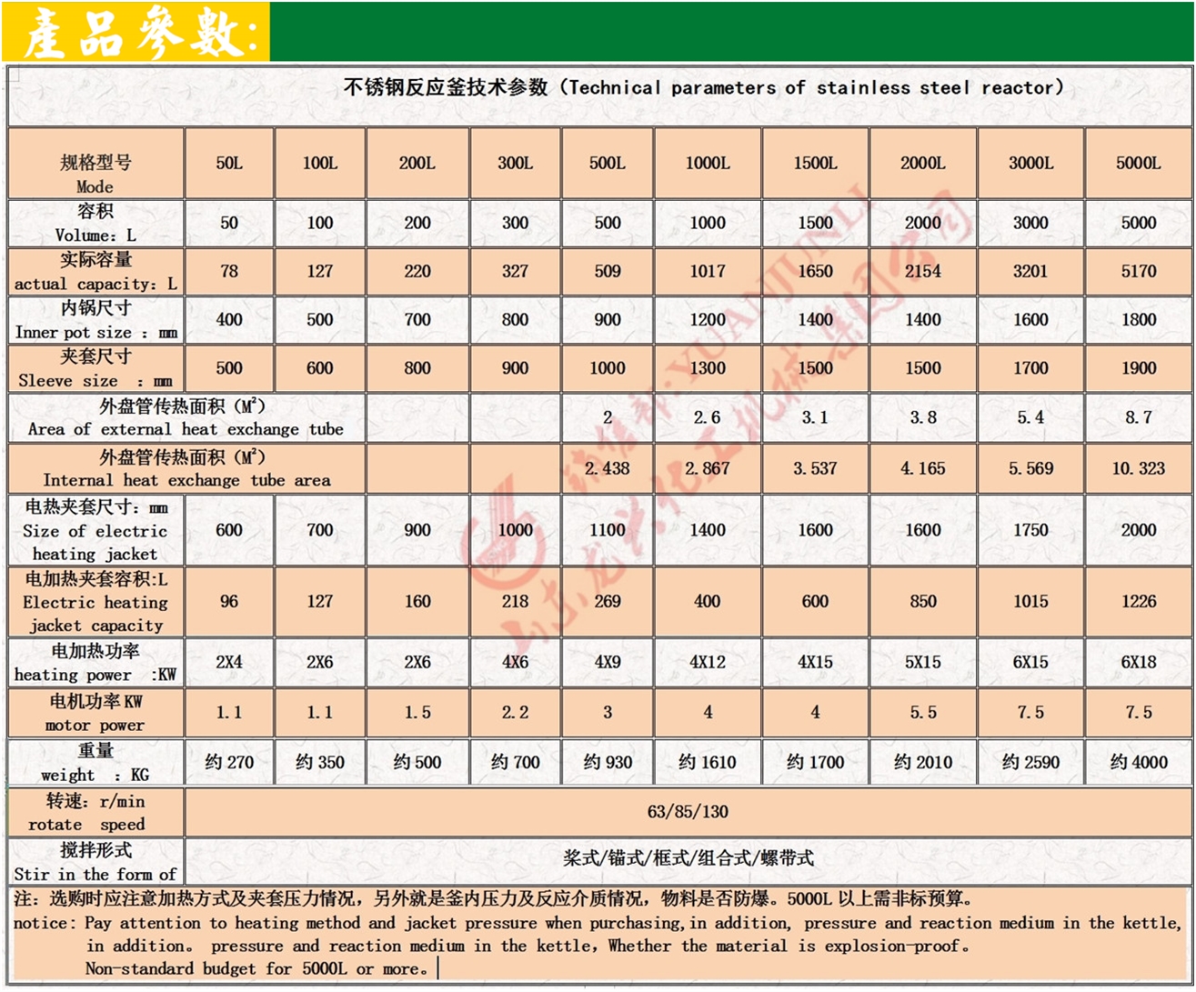 1.加熱形式有電加熱、油加熱、汽加熱、水加熱(或冷卻)、外盤管半圓管加熱等。夾套形式分為:夾套型和外半管型,夾套電油加熱型都設有導流裝置。